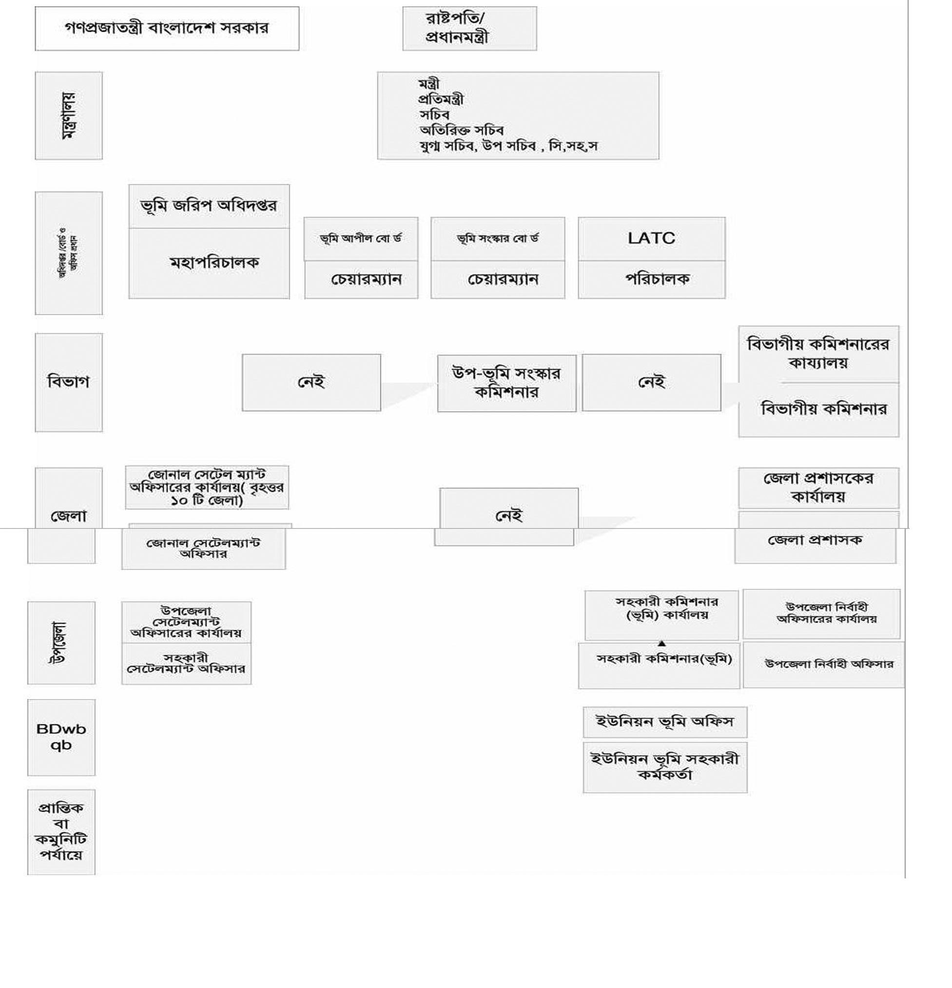 সবার উপরে রয়েছেন বিভাগীয় কমিশনার - অতিরিক্ত বিভাগীয় কমিশনার - জেলা প্রশাসক - অতিরিক্ত জেলা প্রশাসক ( রাজস) - জেলা প্রশাসকের পক্ষে অতিরিক্ত জেলা প্রশাসক ( রাজস) - উপজেলা নিবাহী অফিসার- সহকারি কমিশনার (ভূমি) - কানুনগু - সাভেয়ার - ইউনিয়ন ভূমি সহকারি কমকতা